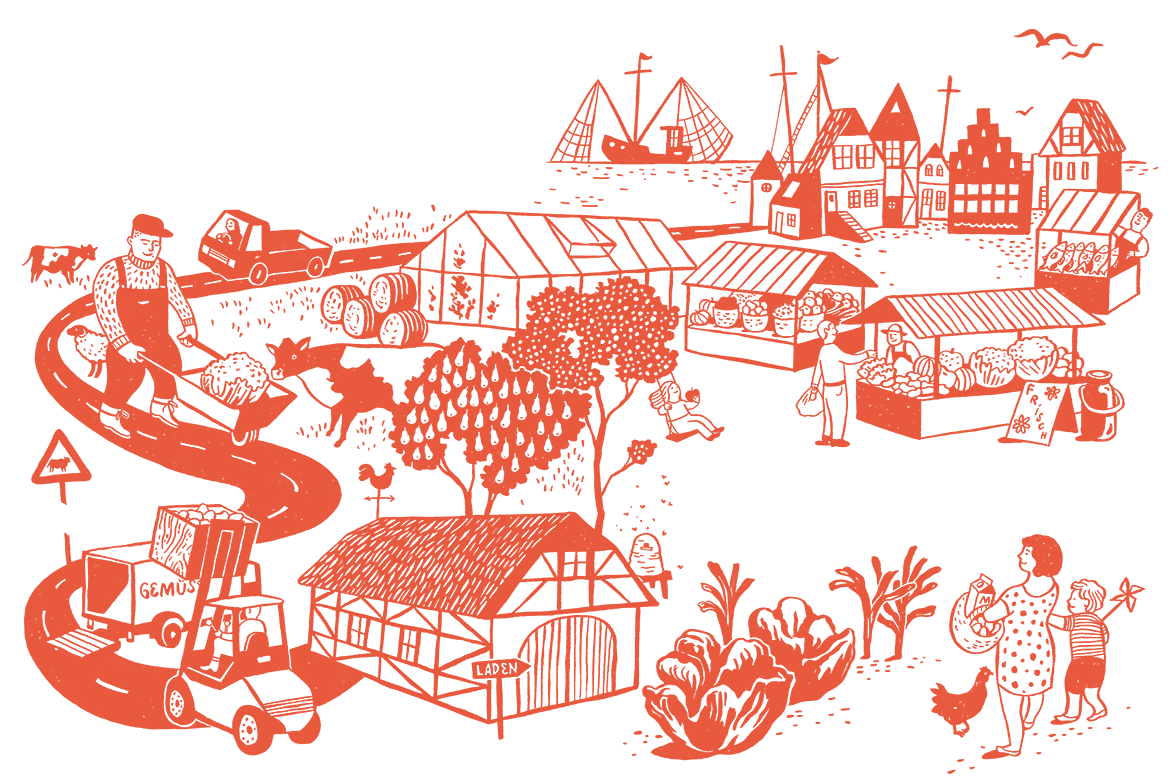 Alles Gute kommt von hier? Aufmacherillustration und Vignetten zu einem Artikel über regionale Lebensmittel aus Schleswig-Holstein, erschienen in 54°Nord Ausgabe 1
